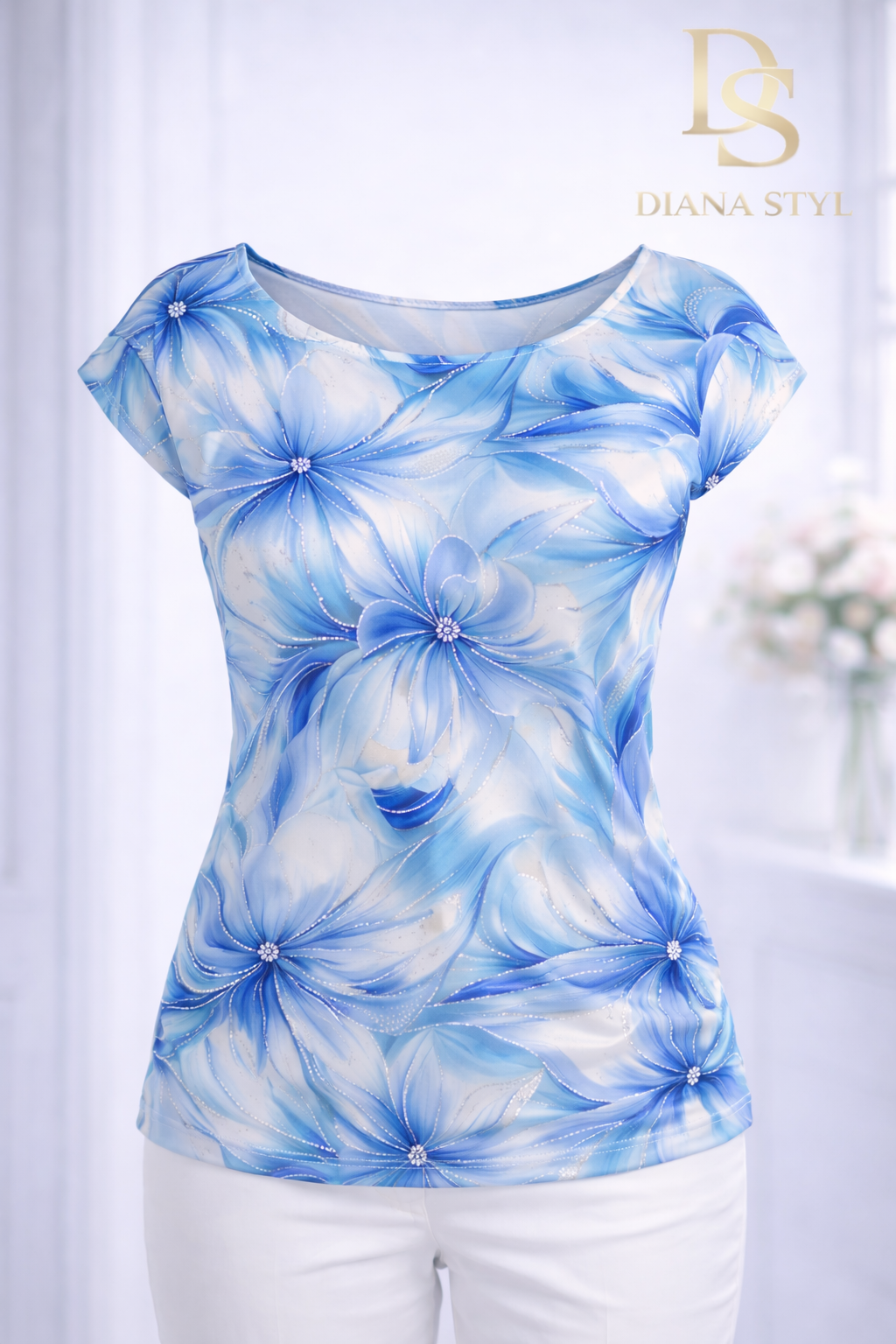Elegantní halenka s klasickým výstřihem a vytříbeným designem, který působí nadčasově a kultivovaně. Jemný vzor inspirovaný plynutím vody v harmonických odstínech modré a bílé dodává modelu svěžest, lehkost a luxusní charakter.