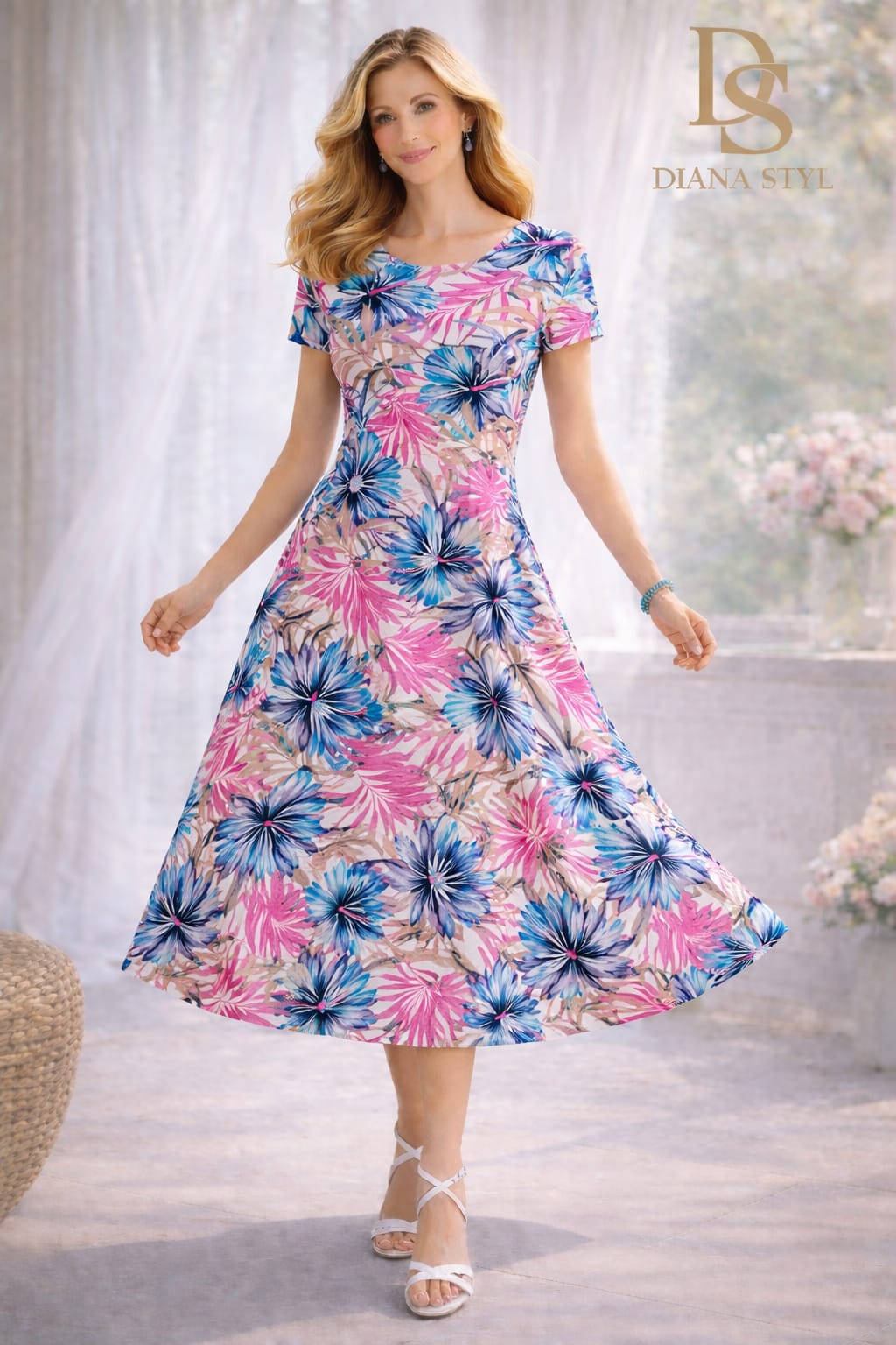 Vzdušné princesové šaty s palmovým motivem v růžových, lehce kávových a bílých tónech působí elegantně. Tyrkysové a modré kvety působí letně