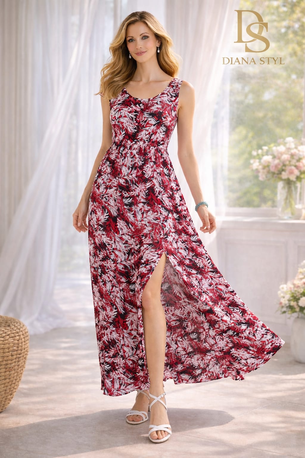 Vzdušné maxi šaty s palmovým motivem v červených a bílých tónech působí elegantně. Lehký, splývavý materiál krásně kopíruje pohyb a vysoký rozparek dodává modelu ženskost a lehkost.